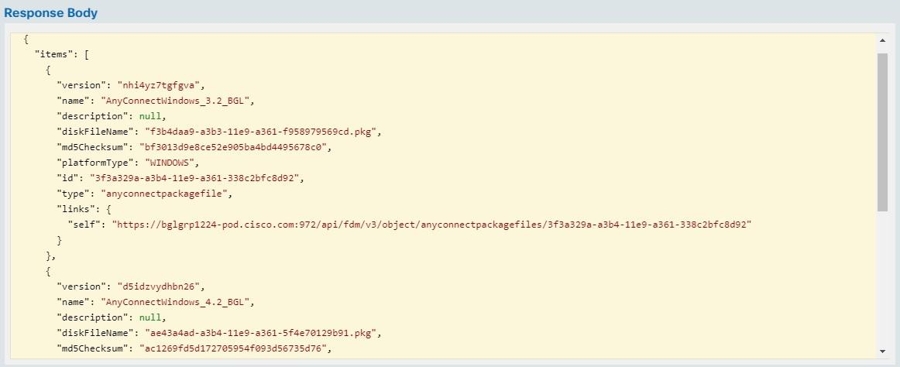 The following figure shows an example of an FDM-managed device with two versions of AnyConnect client software (AnyConnectWindows_3.2_BGL and AnyConnectWindows_4.2_BGL) for Windows OS.