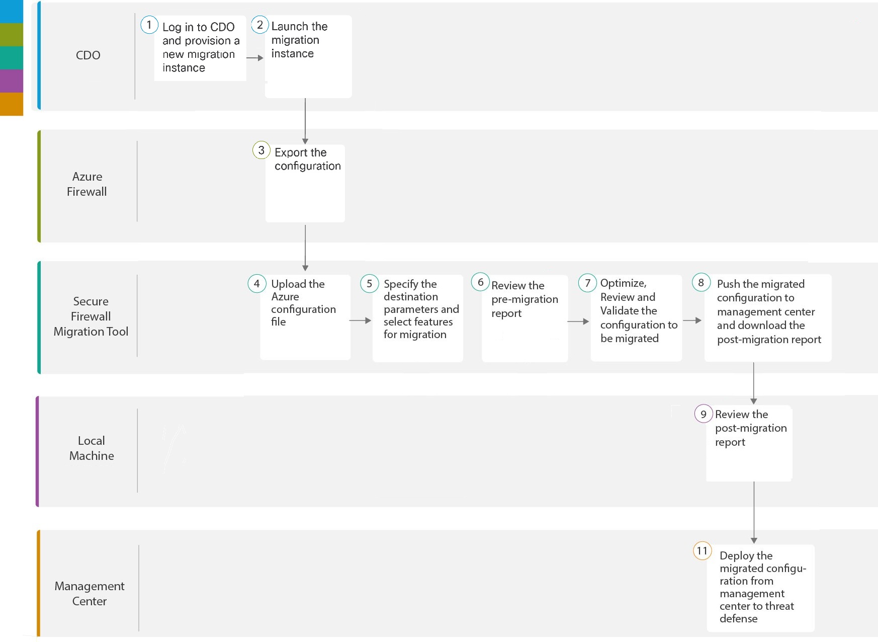This step in the migration process sends the migrated configuration to management center and allows you to download the post-migration report. For detailed steps, see Push the Migrated Configuration to Management Center. |