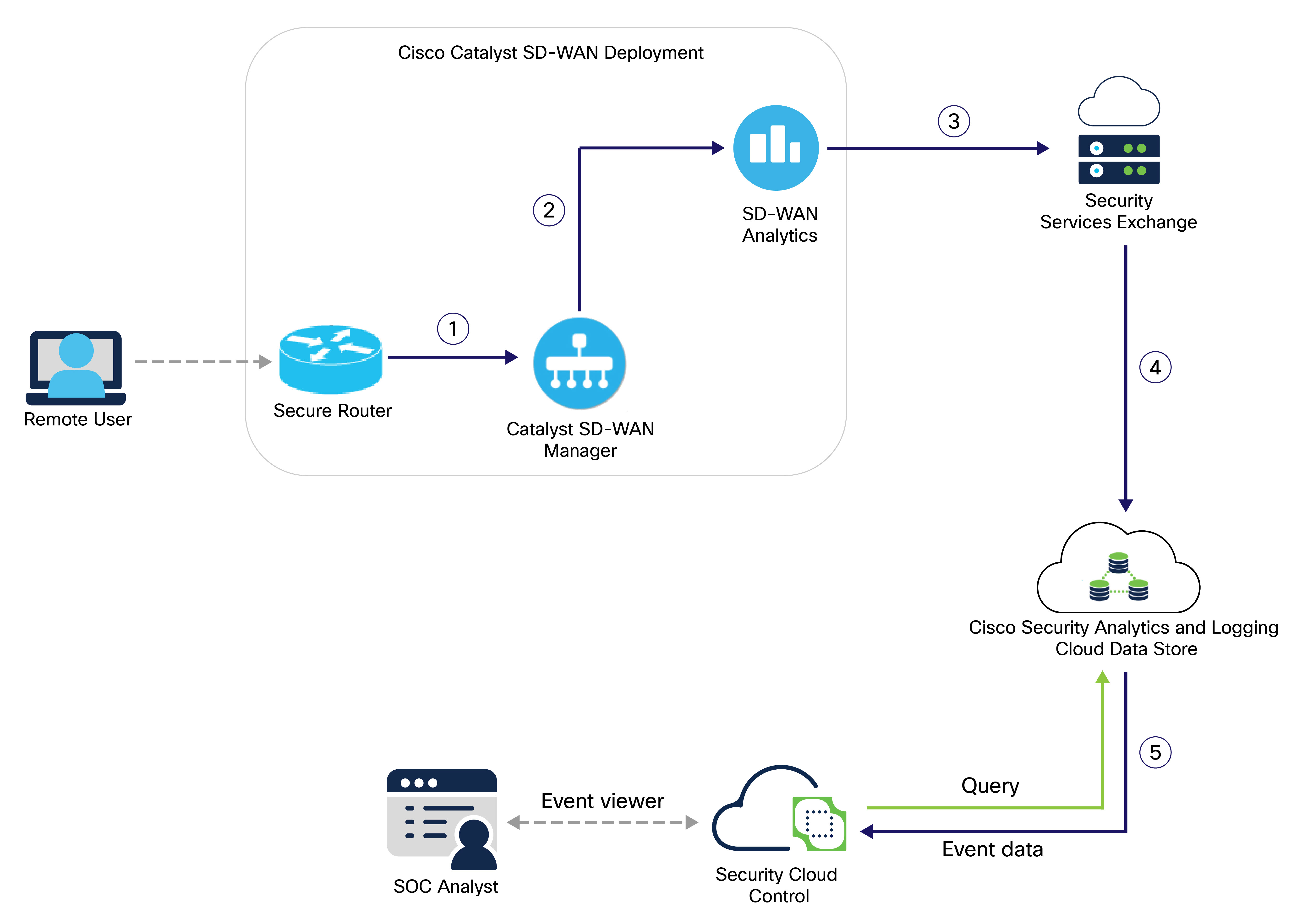 The following diagram describes how Catalyst SD-WAN shares security events with Security Cloud Control Firewall Management.