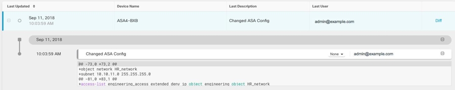 A change log entry reflects the changes to a single device configuration, an action performed on a device, or the change made to a device outside Security Cloud Control: