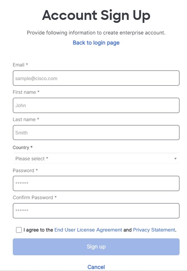 Click Sign up. Cisco sends you a verification email to the address you registered with.