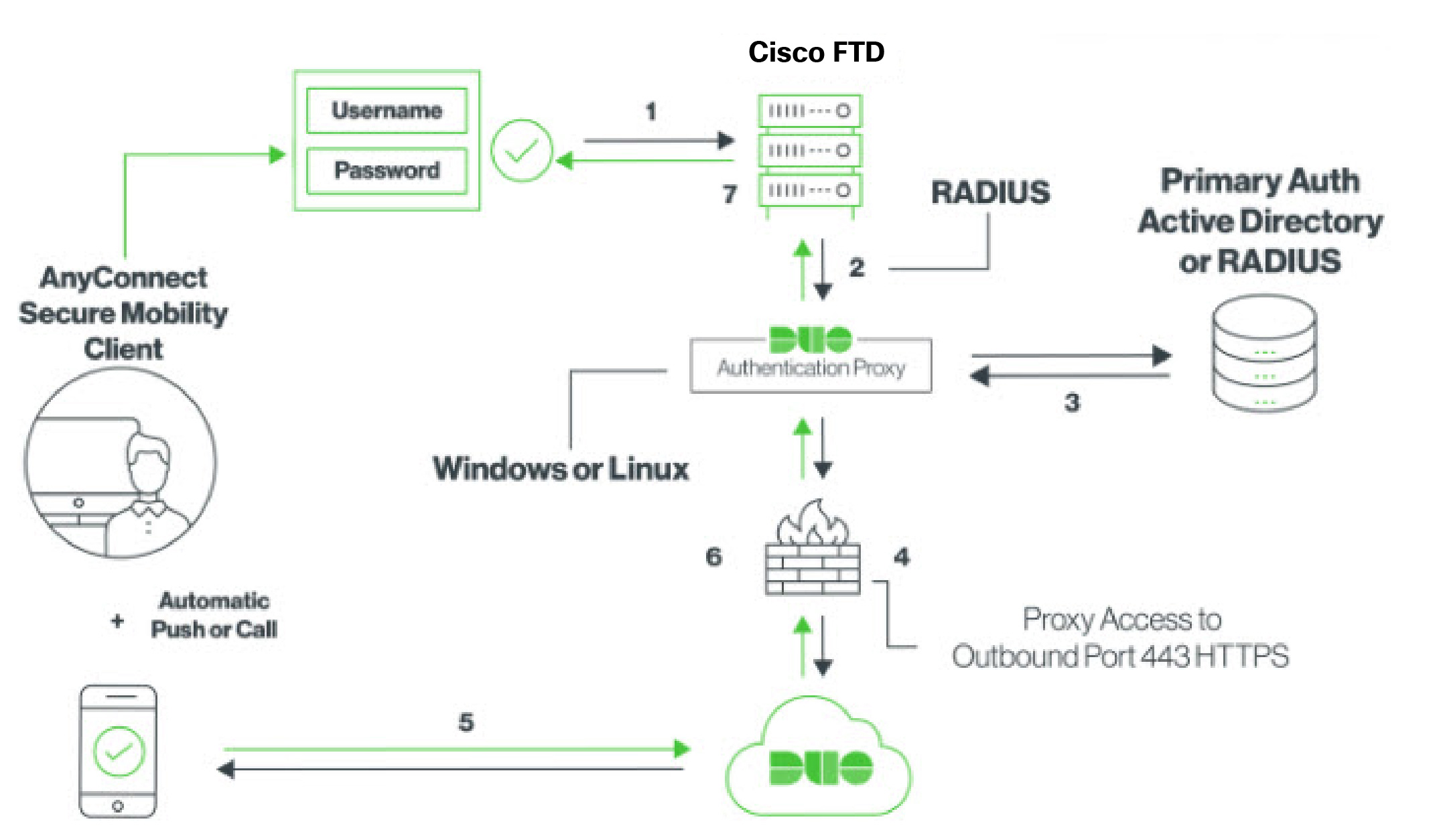 Duo Authentication proxy authenticates this primary authentication attempt with the primary authentication server, which might be Active Directory or RADIUS.