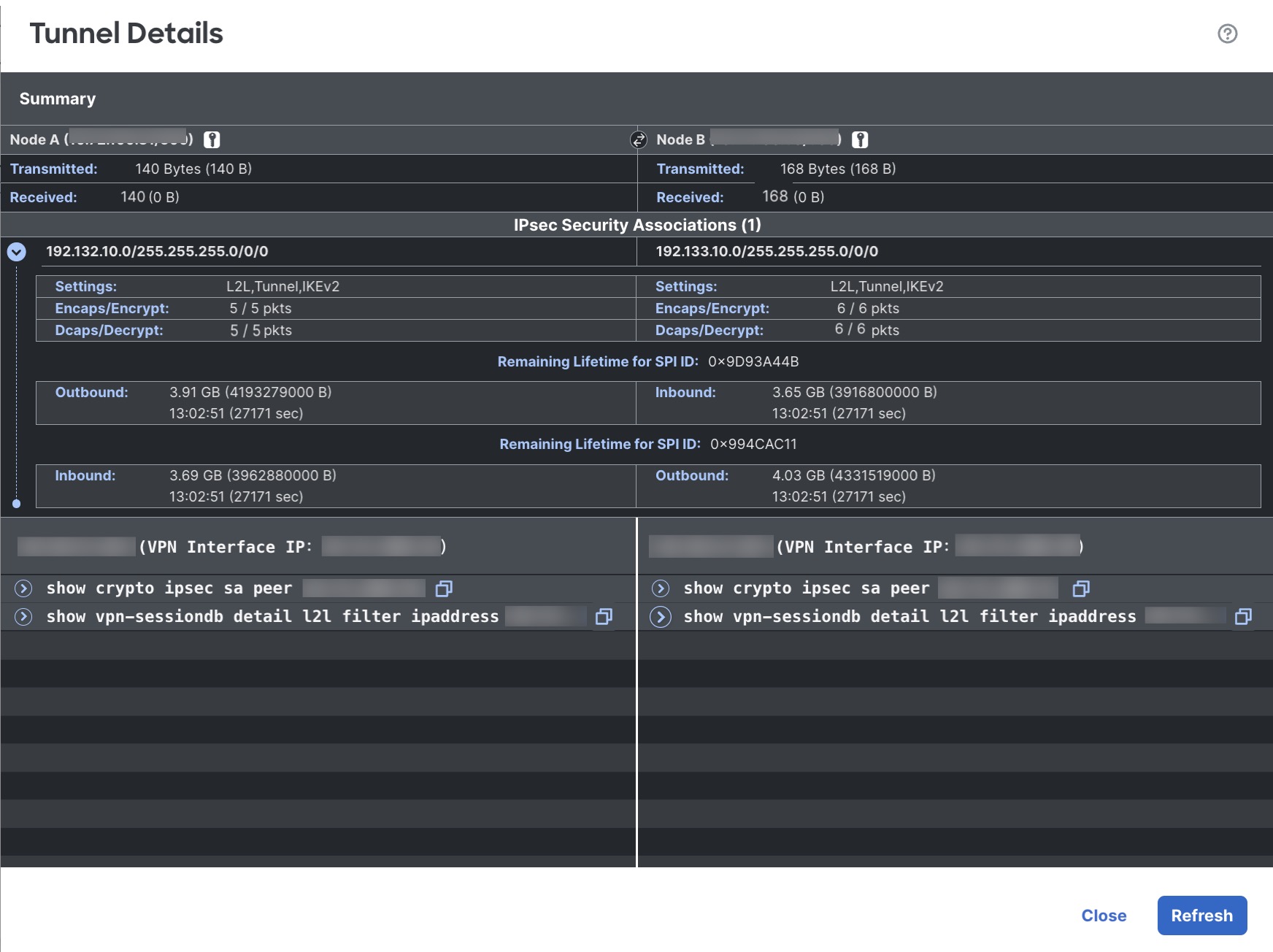Important details about the IKE and IPsec sessions, derived from the above command outputs, appear in a summarized, and user-friendly format. You can view the details of both nodes at a time. The icon next to the node name specifies the authentication type: preshared key or client certificate. The details include IKE statistics per tunnel and IPsec SA statistics as shown below: