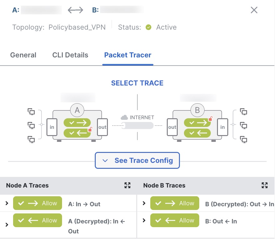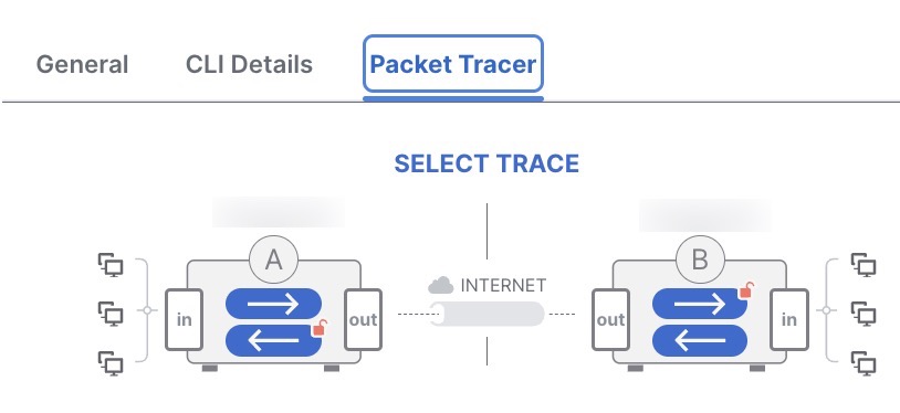Extranet Nodes: You can initiate a packet trace for VPN tunnels with one node as an extranet. For an extranet node, you cannot choose the ingress interface. The remaining steps for the packet trace are the same. You can’t run trace on the extranet side.