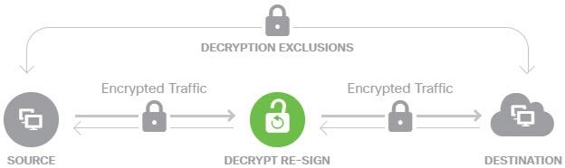 If you elect to decrypt and re-sign traffic, the system acts as a man-in-the-middle.