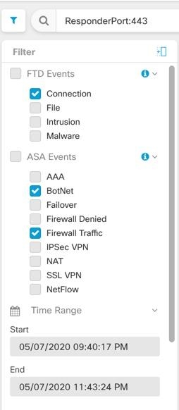 With this filter in use, Security Cloud Control would display threat defense device connection events or ASA BotNet or Firewall Traffic events, and those events that occurred between the two times in the time range, and those events that also contain the ResponderPort 443. You can filter by historical events within a time range. The live events page always displays the most recent events.