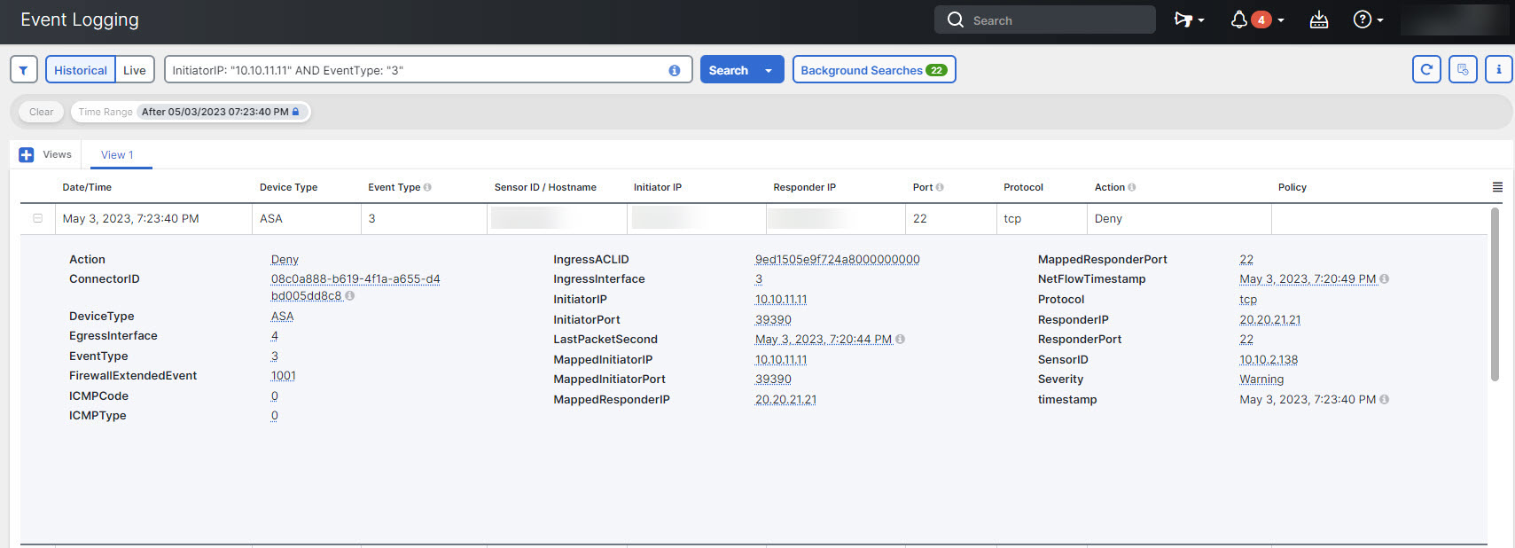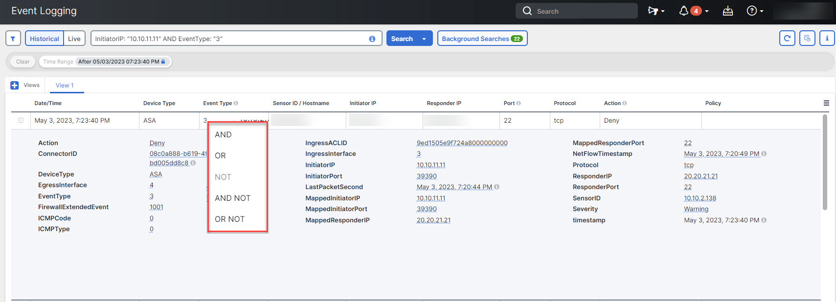 In this example, the search started by rolling over the InitiatorIP value of 10.10.11.11 and clicking it. Initiator IP and it's value were added to the search string. Next, Event Type, 3 was rolled-over and clicked and added to the search string and an AND was added by Security Cloud Control. So the result of this search will be a list of events that were initiated from 10.10.11.11 AND that are 3 event types.