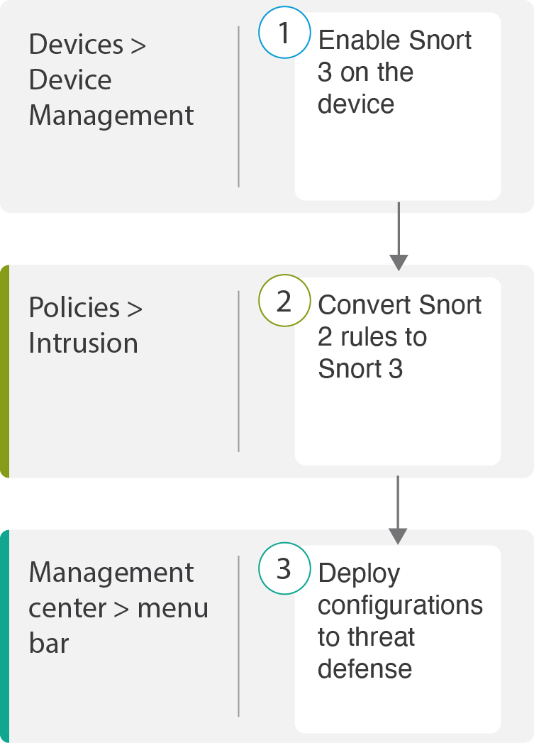 The following flowchart illustrates the workflow for migrating Snort 2 to Snort 3 in Secure Firewall Management Center.
