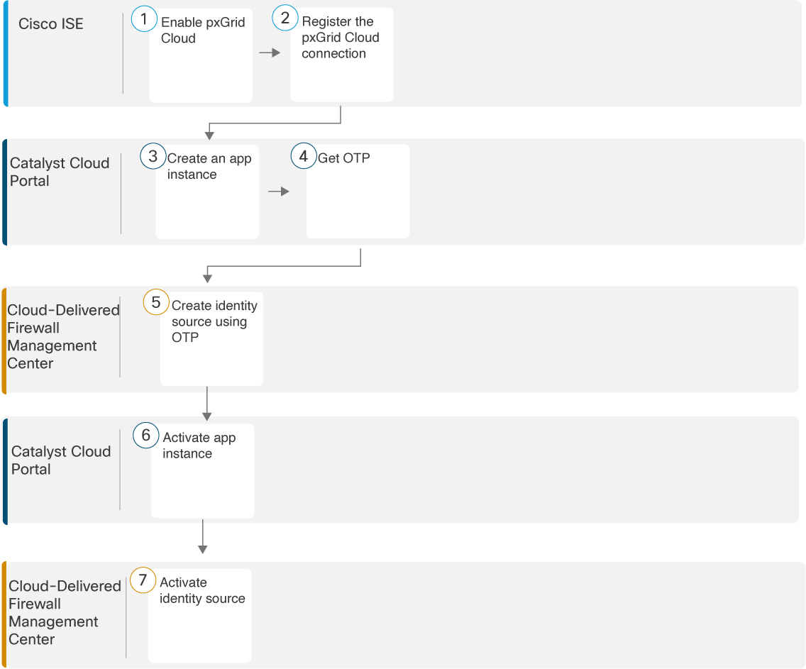The following figure shows the steps to configure a pxGrid cloud identity source using Cisco ISE, the Catalyst Cloud Portal, and Cloud-Delivered Firewall Management Center.