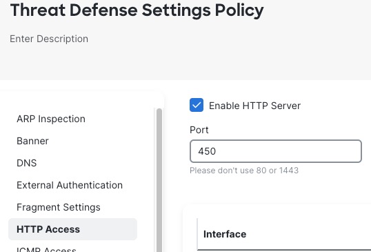 Go to , then edit the Threat Defense Settings policy for the device, click HTTP Access, select the Enable HTTP Server check box, and enter a port other than 443 in the field. When you're finished, click Save in the upper right corner of the page.