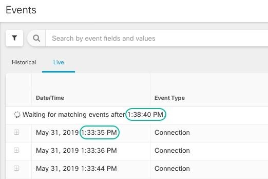 There may be a small lag between the Secure Event Connector or the Security Service Exchange receiving events and Security Cloud Control posting events in the Live events viewer. You can view the gap on the Live page. The time stamp of the event is the time it was received by Secure Event Connector or the Security Service Exchange.