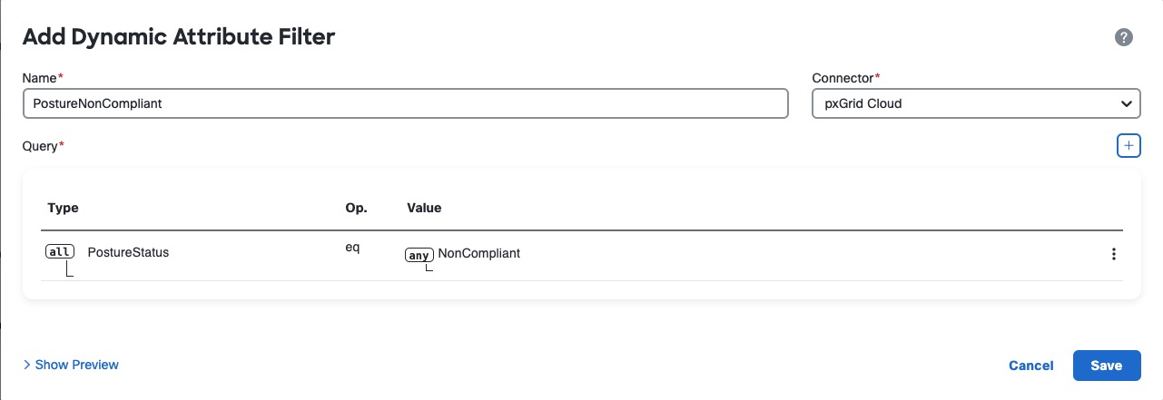 The following example shows one criterion: PostureStatus is NonCompliant.