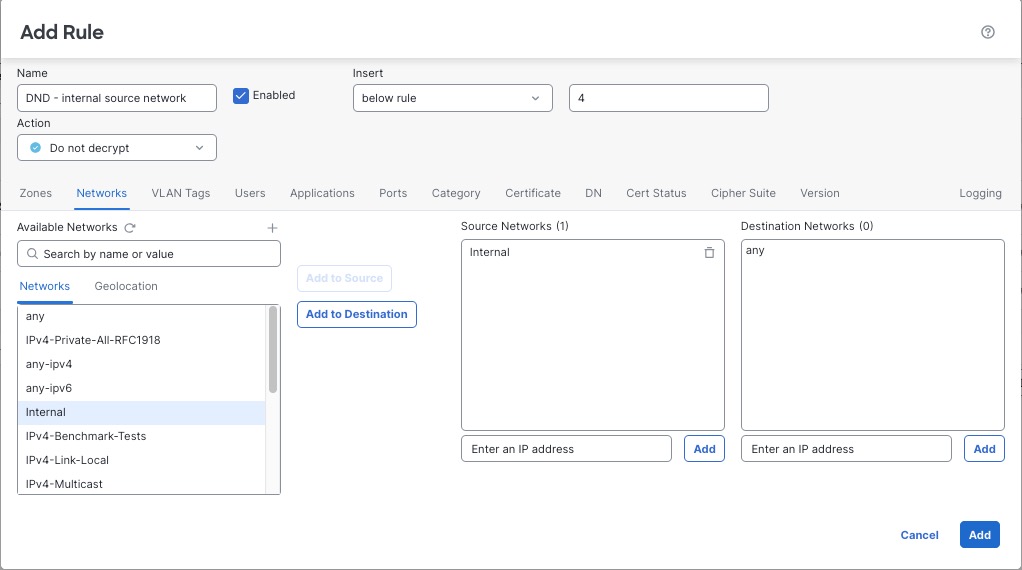 Note | If you have traffic going from internal DNS servers to internal DNS resolvers (such as Cisco Umbrella Virtual Appliances), you can add Do Not Decrypt rules for them as well. You can even add those to prefiltering policies if the internal DNS servers do their own logging. However, we strongly recommend you do not use Do Not Decrypt rules or prefiltering for DNS traffic that goes to the internet, such as internet root servers (for example, Microsoft internal DNS resolvers built into Active Directory). In those cases, you should fully inspect the traffic or even consider blocking it. |