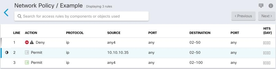 This is how Security Cloud Control displays the rules described in the "example" network policy above: