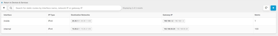 Interface:Inside Destination_N/W:20.30.1.0/24 Gateway: 192.168.50.20 Metric: 100
