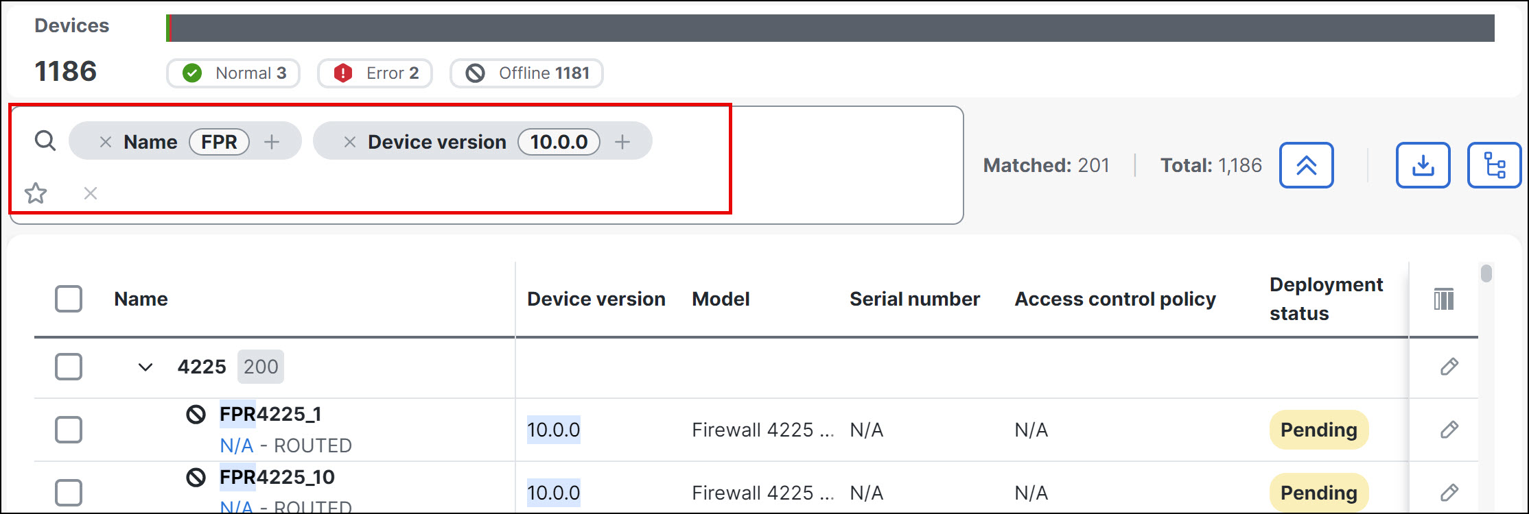 In the example shown in the figure, the filter searches for devices with names that contain "FPR" andare of version of “10.0.0”.