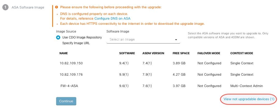 Step 9 | In step 1, click Use Security Cloud Control Image Repository to select the ASA software image you want to upgrade to, and click Continue. The list indicates how many of the ASAs you chose can be upgraded to the software version you chose. In the example below, all of the devices can be upgraded to version 9.9(1.2), two devices can be upgraded to 9.8(2), and one of the devices can be upgraded to 9.6(1). Security Cloud Control alerts you if any of the software versions you chose are incompatible with any of the devices you chose. In the example below, Security Cloud Control cannot upgrade the 10.82.109.176 device to a version earlier than it already runs. | ||