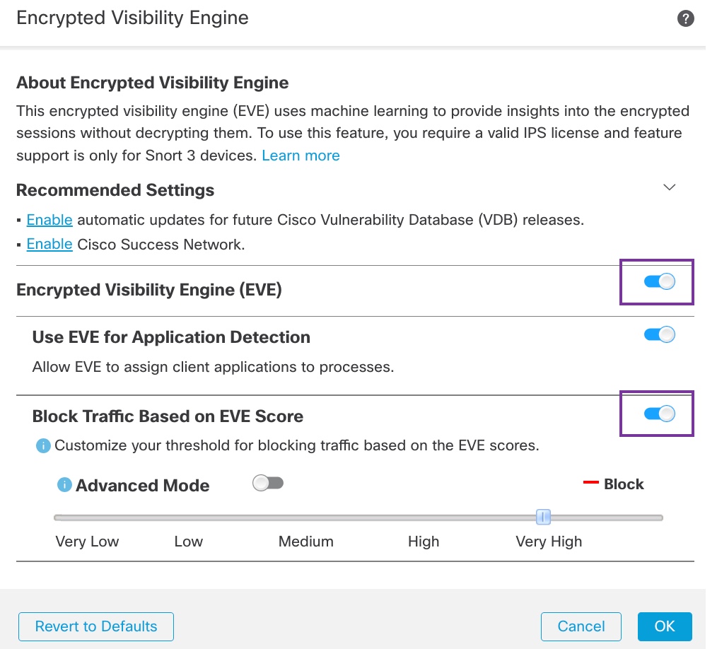 Step 5 | In the Encrypted Visibility Engine page, enable the Encrypted Visibility Engine (EVE) toggle button. | ||