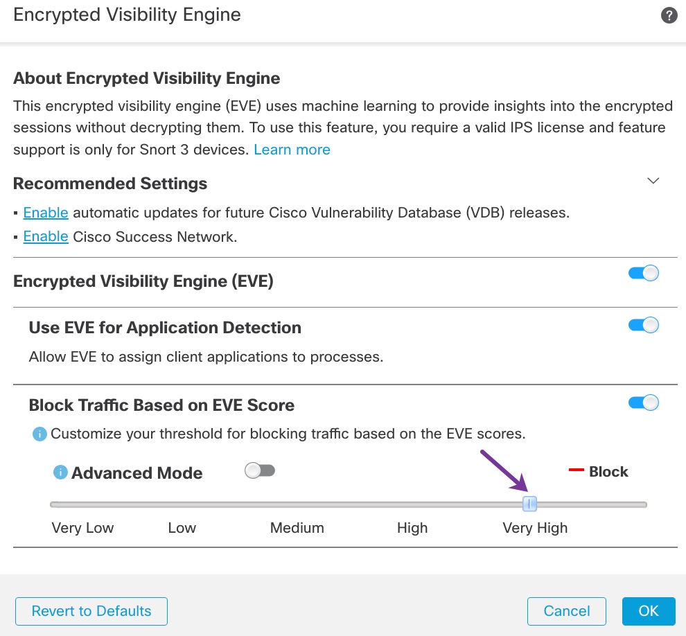 Step 7 | Use the slider to adjust the threshold for blocking based on EVE threat confidence. This ranges from Very Low to Very High. In this example, the slider is set to Very High.