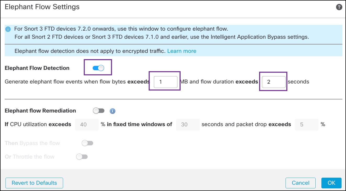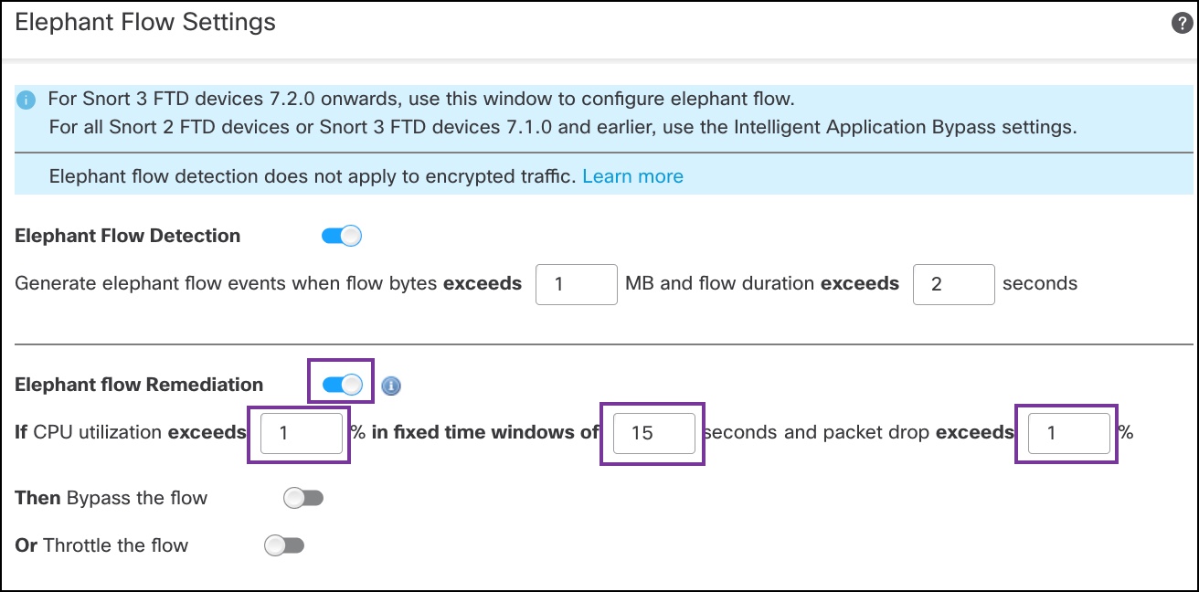 Step 6 | Enable the Elephant Flow Remediation toggle button. When an elephant flow is detected, you can choose to bypass or throttle the flow. Bypassing a flow means that the traffic is allowed to pass without Snort inspection. Throttling indicates that the flow throughput is reduced. This rate reduction is done in 10 percent increments until the CPU utilization reduces to lesser than the configured threshold. As a test setting, configure the elephant flow remediation parameters as shown in the following figure.