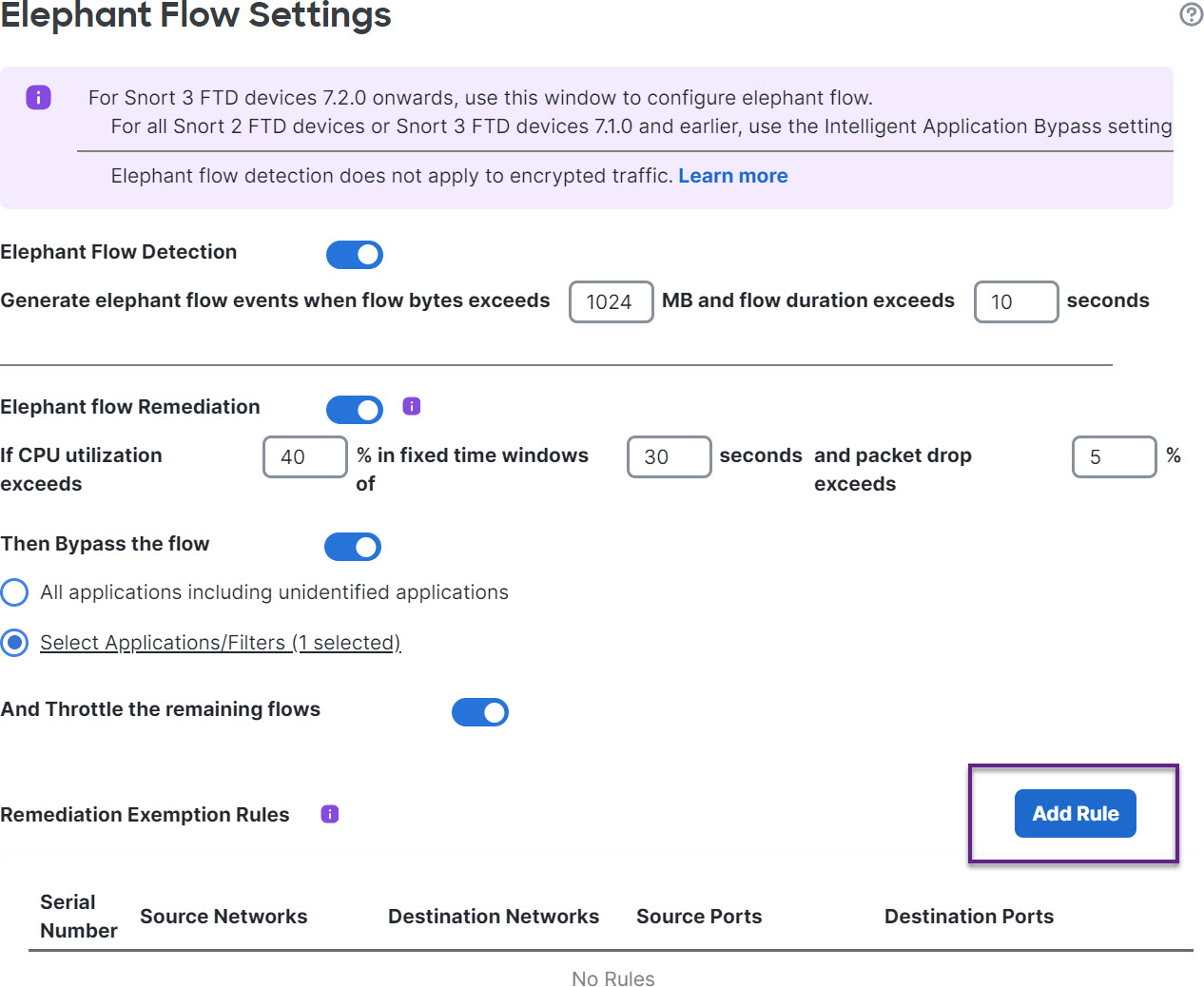 You can configure L4 access control list (ACL) rules for flows that must be exempted from remediation. If a flow is detected as an elephant flow and it matches the rules that are defined, that flow is exempted from the remediation action.