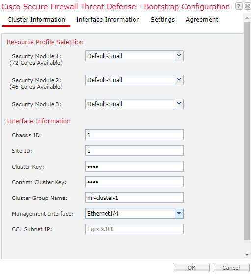 For the Firepower 9300, this profile will be applied to each instance on each security module. You can set different profiles per security module later in this procedure; for example, if you are using different security module types, and you want to use more CPUs on a lower-end model. We recommend choosing the correct profile before you create the cluster. If you need to create a new profile, cancel out of the cluster creation, and add one using Add a Resource Profile for Container Instances.