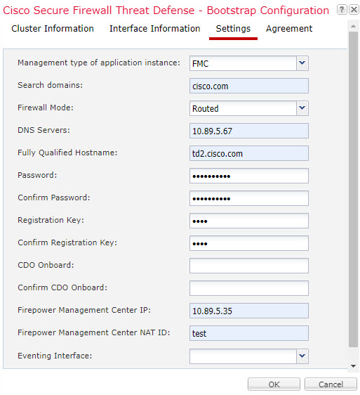 (Optional) In the Firepower Management Center NAT ID field, enter a passphrase that you will also enter on the Firewall Management Center when you add the cluster as a new device.