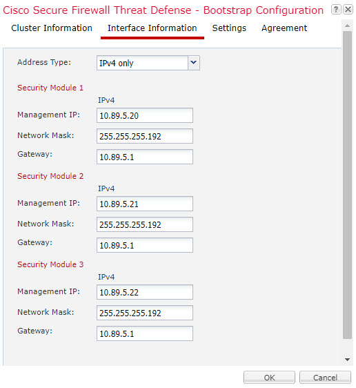 On the Interface Information page, configure a management IP address for each security module in the cluster. Select the type of address from the Address Type drop-down list and then complete the following for each security module.