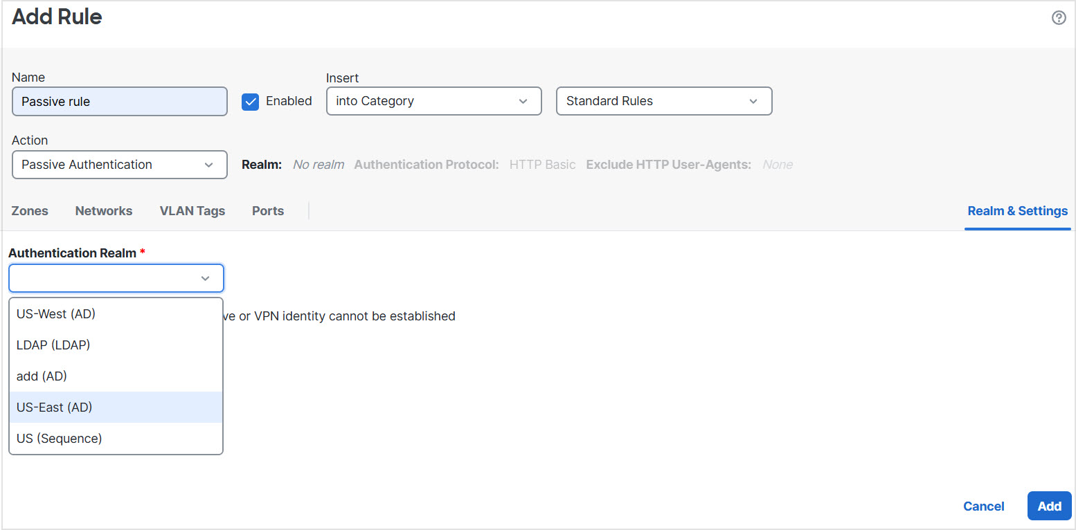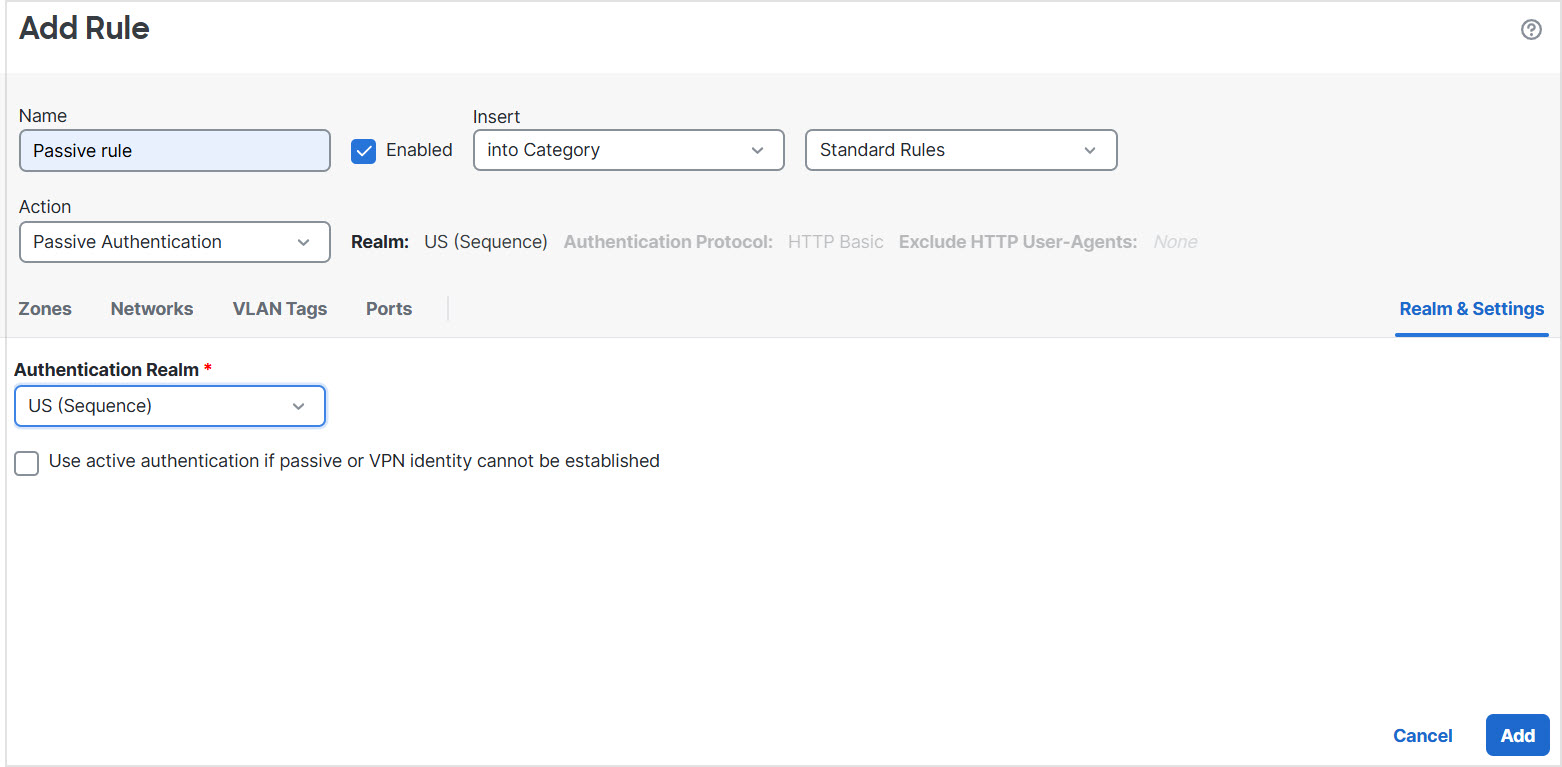 This task discusses how to create an identity policy with a passive authentication rule that authenticates users using the US realm sequence. If a user is not found in the first realm in the sequence, the system searches the other realms in the sequence in the order listed in the realm sequence. If a user is still not found in the realm or realm sequence, the user is identified as Unknown.