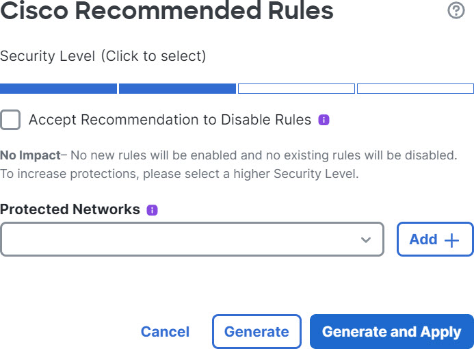 In the Cisco Recommended Rules window, you can set the security level.
