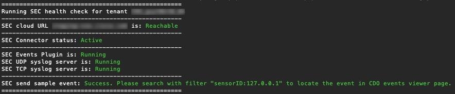 After the SEC is onboarded, the sec.sh runs a script to check on the health of the SEC. If all the health checks are "green," the health check sends a sample event to the Event Log. The sample event shows up in the Event Log as a policy named "sec-health-check."