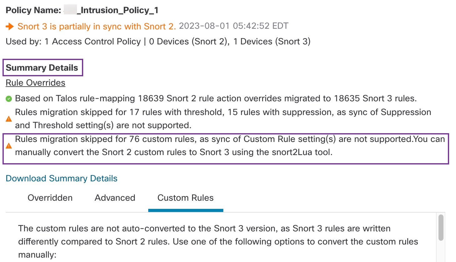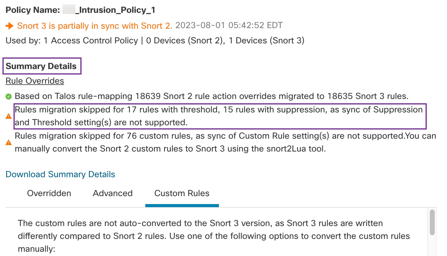 The Summary Details section lists the rules that were migrated or skipped. In our use case, there are 76 custom Snort 2 rules, 17 rules with thresholds, and 15 rules with suppression that were skipped during the sync process. To migrate the custom rules, go to the next step.