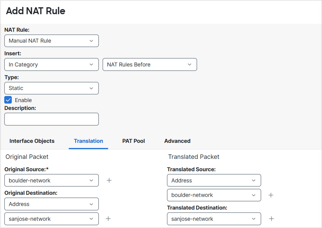 The following figure shows a site-to-site tunnel connecting the Boulder and San Jose offices. For traffic that you want to go to the Internet (for example from 10.1.1.6 in Boulder to www.example.com), you need a public IP address provided by NAT to access the Internet. The below example uses interface PAT rules. However, for traffic that you want to go over the VPN tunnel (for example from 10.1.1.6 in Boulder to 10.2.2.78 in San Jose), you do not want to perform NAT; you need to exempt that traffic by creating an identity NAT rule. Identity NAT simply translates an address to the same address.