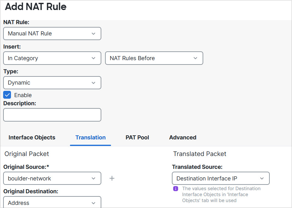 Step 3 | Configure manual dynamic interface PAT when going to the Internet for the inside Boulder network on Firewall1 (Boulder). |