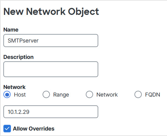Step 3 | Create a network object for the SMTP server. |