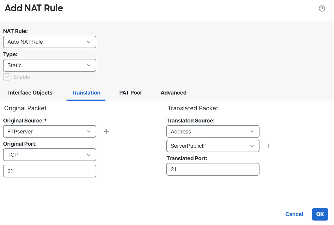 Step 5 | Configure static NAT with port translation for the FTP server, mapping the FTP port to itself. |