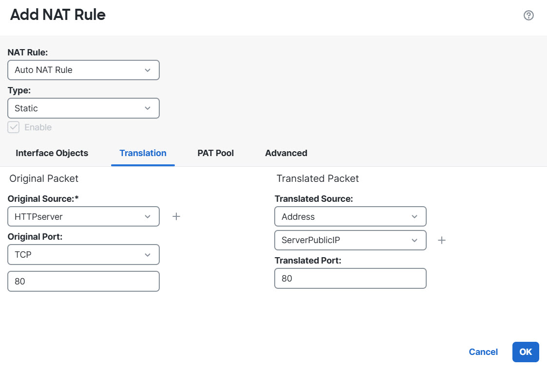 Step 6 | Configure static NAT with port translation for the HTTP server, mapping the HTTP port to itself. |