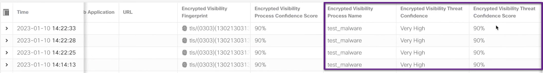 Step 3 | The following is an example of the Encrypted Visibility Process Name as test_malware, Encrypted Visibility Threat Confidence as Very High, and Encrypted Visibility Threat Confidence Score as 90 percent.