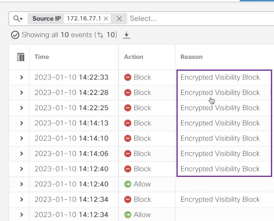 Step 2 | If you have configured EVE to block traffic, the Reason field shows Encrypted Visibility Block.