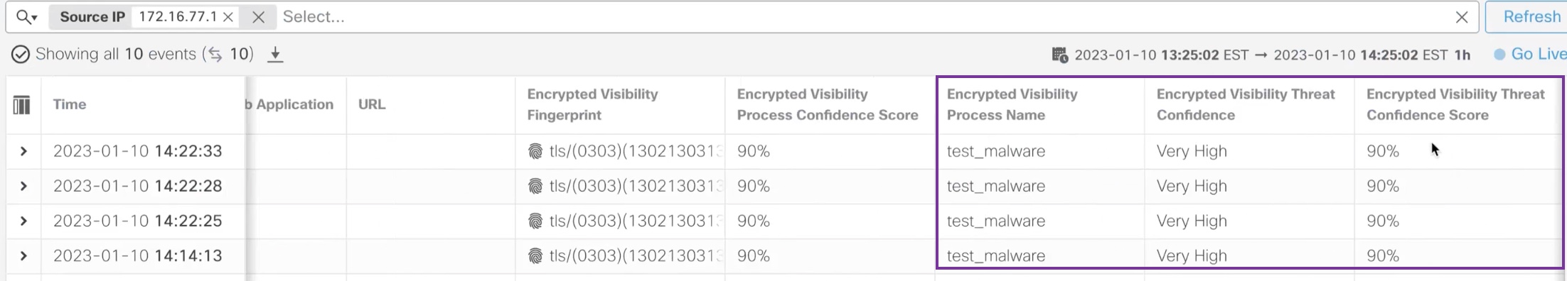 Step 3 | The following is an example of the Encrypted Visibility Process Name as test_malware, Encrypted Visibility Threat Confidence as Very High, and Encrypted Visibility Threat Confidence Score as 90 percent.