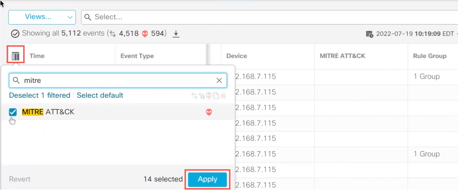 Step 6 | If not enabled, click the column selector icon to enable the MITRE ATT&CK and Rule Group columns.