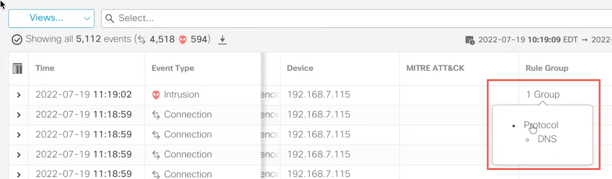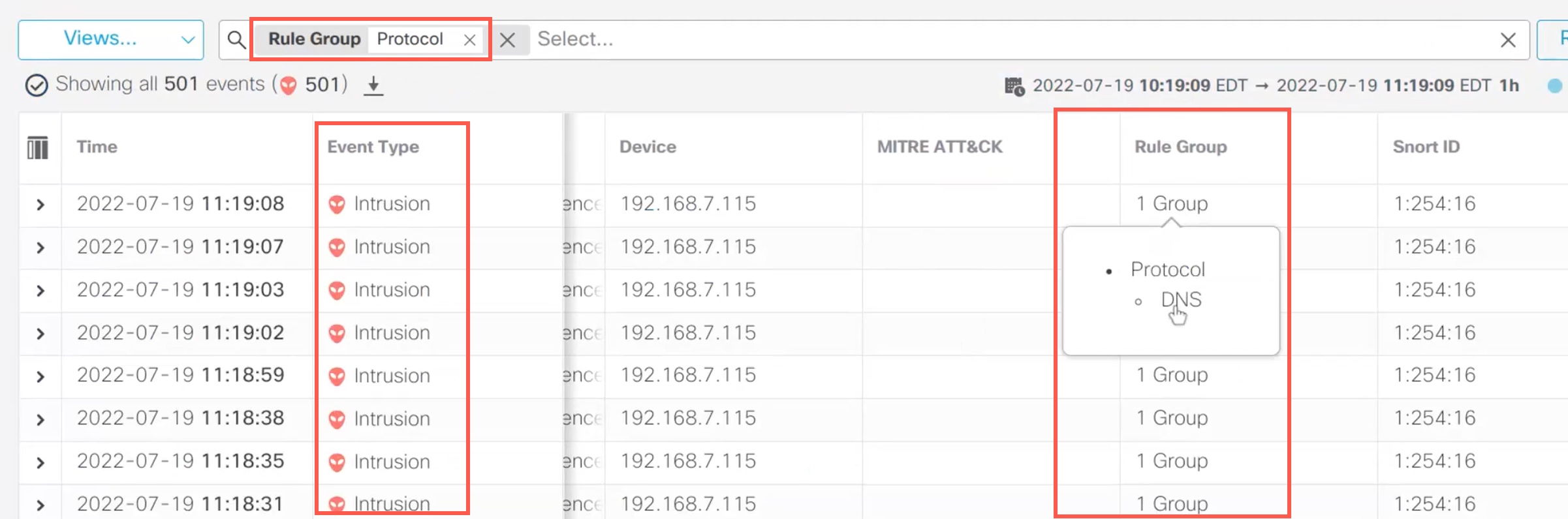 Step 8 | You can view Protocol, which is the parent rule group, and the DNS rule group under it. Choose to search for all the intrusion events that have at least one rule group that is .