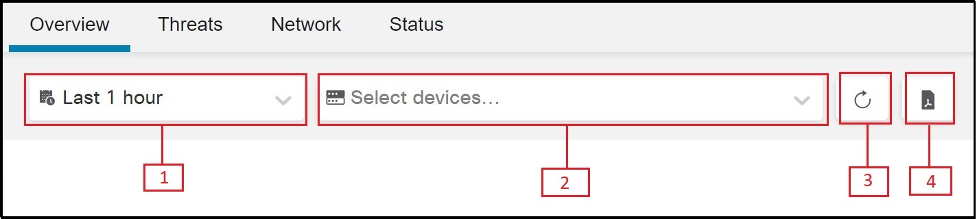 You can use this dashboard to view collective information that is related to the device status and the overall health of the devices in your deployment. The information that the FTD dashboard provides depends on how you license, configure, and deploy the devices in your system. Although, the FTD dashboard displays data for all CDO-managed threat defense devices, you can choose to filter device-based data. You can also choose the time range to display for specific time range.