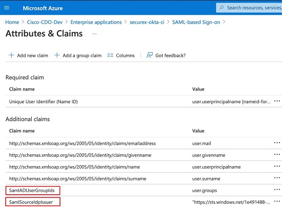 SamlSourceIdpIssuer - This attribute uniquely identifies an AD instance. For example, in Azure select+ Add a group claim and scroll to locate the Azure AD Identifier as seen in the screenshot below: