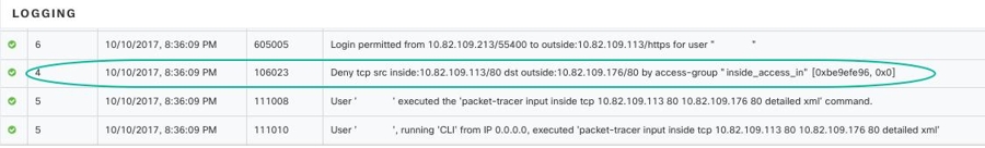 Packet tracer also displays a real time log of the result of the packet trace. In the example below, you can see where a rule denied a tcp packet.