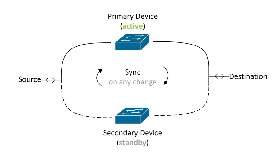 The units form an active/standby pair, where the primary unit is the active unit and passes traffic. The secondary (standby) unit does not actively pass traffic, but synchronizes configuration and other state information from the active unit. The two units communicate over the failover link to determine the operating status of each unit.