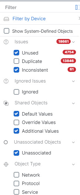 The object filter allows you to filter by device, issue type, shared objects, unassociated objects, and object type. You can include system objects in your results or not. You can also use the search field to search for objects in the filter results that contain a certain name, IP address, or port number.