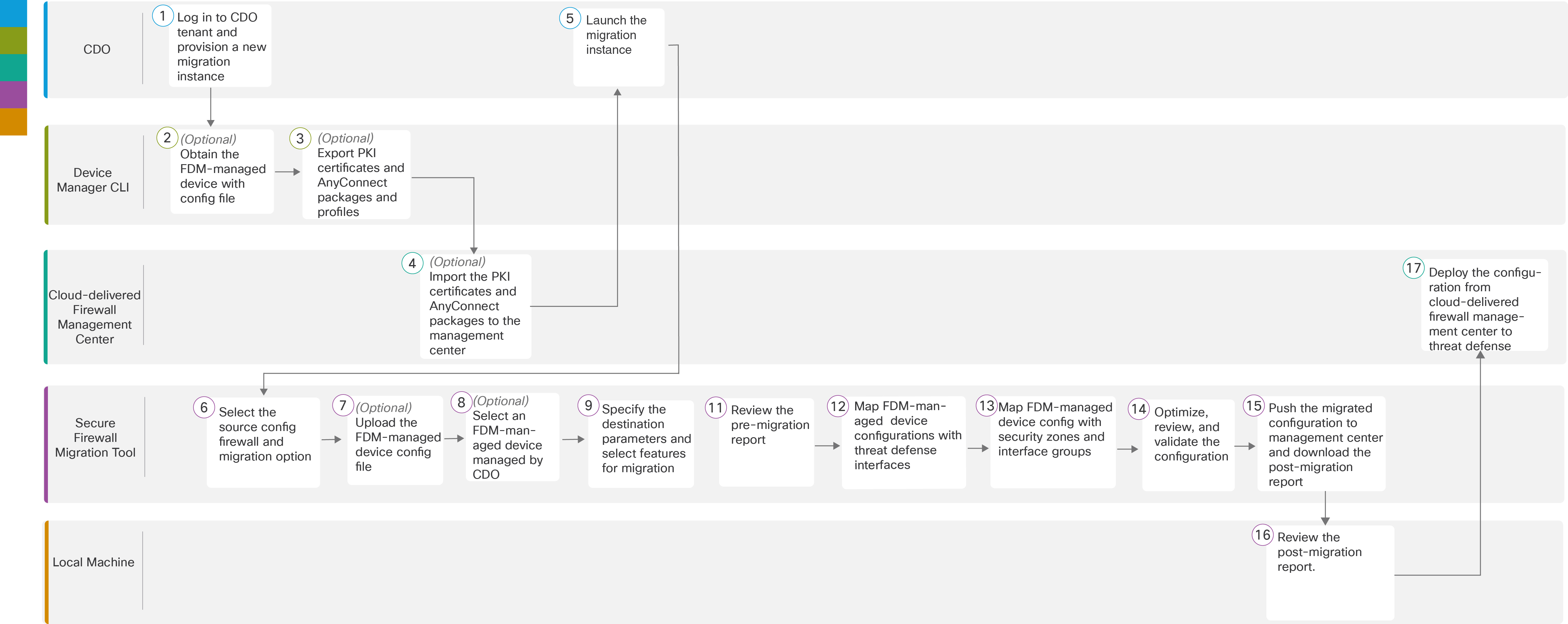 The flowchart that follows illustrates the step-by-step procedure for migrating an FDM-managed device using the Firewall migration tool in CDO.