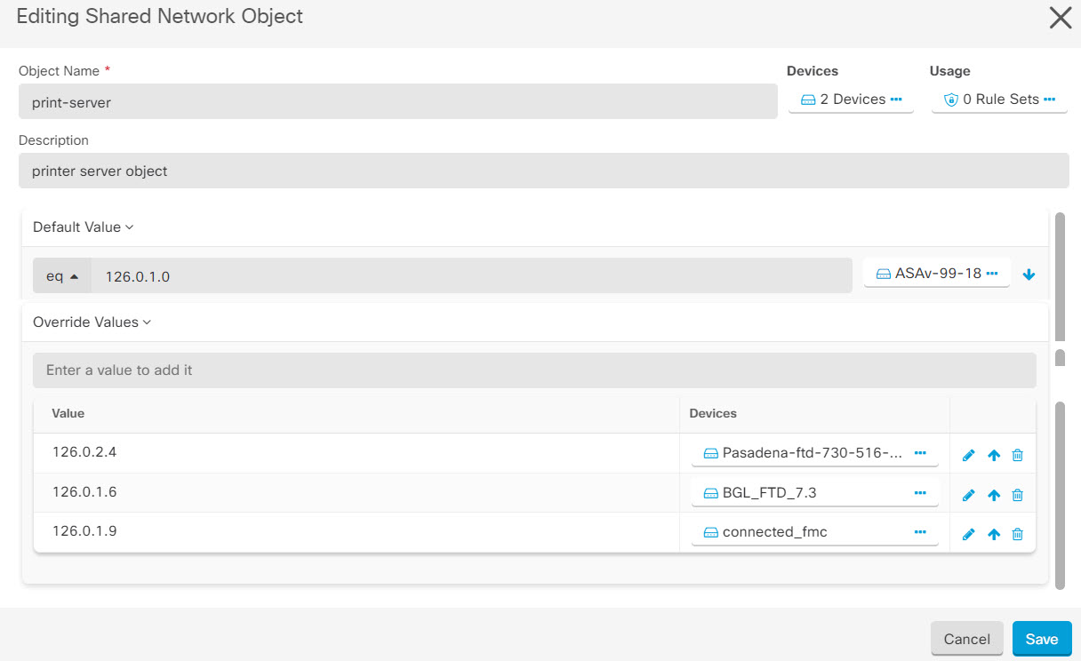 An object override allows you to override the value of a shared network object on specific devices. CDO uses the corresponding value for the devices that you specify when configuring the override. Although the objects are on two or more devices with the same name but different values, CDO doesn't identify them as Inconsistent objects only because these values are added as overrides.