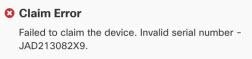 An incorrect serial number has been entered while claiming the device in Cisco Defense Orchestrator.